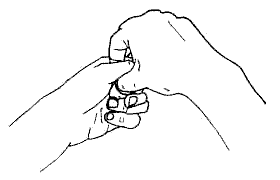 Ta sukkerpakka med venstre hånd (tommelen i fingerpalmering), og knips på et hjørne med høyre hånd. Riv av dette hjørnet, kast det og ta pakka i høyre hånd. Tøm sukker ned i din venstre hånd, rett i tommelspissen. (fig.1) Kast det tomme papiret ned på lommetørklet og børst av det overflødige sukkeret på venstre hånd med høyre hånd. Før begge hender litt til siden for å se på lommetørklet, gjør en bemerkning om sølet, og stjel tommelspissen. (fig.2) Legg merke til at den stjeles ut på baksiden og ikke fra toppen av din knyttede hånd. Dermed ser alt mer naturlig ut, og du får mer fysisk dekning for grepet. Fortsett å børste et par ganger med tommelspissen på tommelen (skjult bak fingrene til høyre hånd) og gå så ned i høyre bukselomme hvor du slipper tommelspissen og tar opp lighteren. Imens har du din oppmerksomhet rettet mot venstre hånd, som du løfter opp til skulderhøyde. fig.1 fig.2 Tenn lighteren og varm opp venstre hånd med flammen. Gjør klemmende og knaende bevegelser med venstre hånd som om du prøver å forme sukkeret. Putt lighteren ned i høyre jakkelomme, fingerpalmer sukkerbiten og ta opp hånda fra lommen. Alt dette mens du fortsetter å se på venstre hånds bevegelser. Nå skal du utføre et frekt lite grep, som vil overbevise tilskuerne om at sukkerbiten kommer fra din venstre hånd. Avslutt venstre hånds knaing mens høyre hånd henger avslappet langs siden. Gjør en liten pause for å øke spenningen. Før så hendene mot hverandre samtidig som du snur dem begge. Venstre hånd vender du med håndflaten ned når fingrene strekkes ut, som om du plasserte noe i høyre hånd. Høyre hånd vender du med håndflaten opp og strekker fingrene idet venstre hånd treffer den. Resultatet er at sukkerbiten kommer til syne akkurat i det øyeblikket venstre hånd tilsynelatende plasserer noe der. Du kan tenke på det som en halv shuttle pass, og illusjonen er perfekt. Til og med tryllekunstnere blir lurt av dette grepet. Hvis du vil kan du gi bort sukkerbiten før du pakker sammen tørklet og putter alt sammen i lommen. Dette virker kanskje enkelt når du leser det, og på en